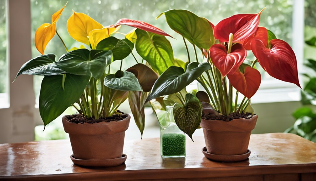 Aby wybrać odpowiedni nawóz dla swojego Anthurium, zdecyduj się na zrównoważony nawóz rozpuszczalny w wodzie z stosunkiem N-P-K odpowiednim dla roślin kwitnących. Opcje bogate w potas mogą zwiększyć produkcję kwiatów, podczas gdy organiczne wybory, takie jak skórki bananów i fusy po kawie, dostarczą niezbędnych składników odżywczych. Stosuj nawóz co 2-6 tygodni w okresie wzrostu i zmniejsz do raz w miesiącu zimą. Zawsze rozcieńczaj domowe nawozy, aby uniknąć poparzenia korzeni, i monitoruj swoją roślinę pod kątem oznak niedoborów składników odżywczych. Obserwowanie tych czynników pomoże Twojemu Anthurium pięknie prosperować, a jest jeszcze wiele do odkrycia w zakresie doskonalenia technik pielęgnacji roślin.